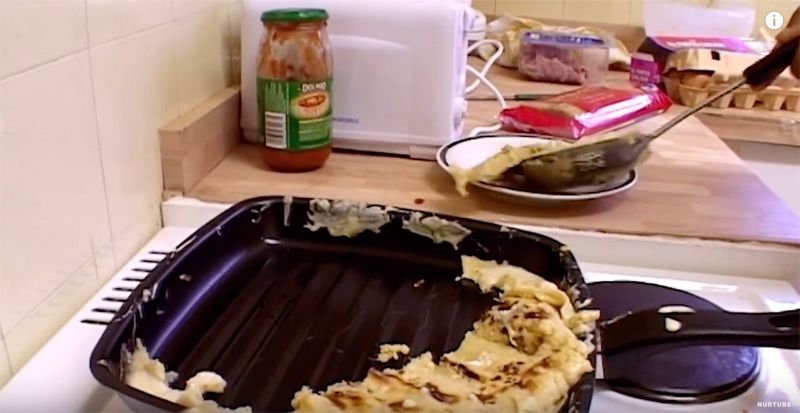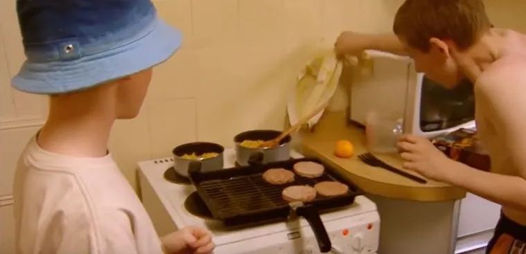这两个男孩手忙脚乱,想要努力做点能吃的东西,烤肉饼、炸薯条、煮玉米粒同时进行,结果油烟让警铃大响、抹布被烧糊、食物也翻滚在地......