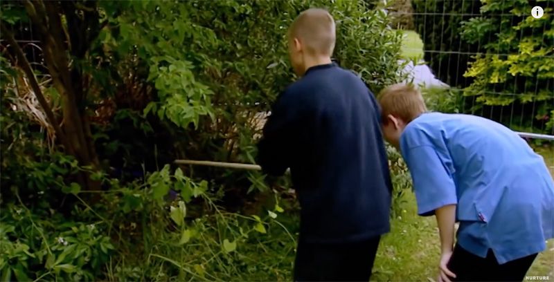 男孩们如同困兽。这时,暴力本能也开始复苏。大家把情绪释放在花园里“捉刺猬”的游戏上,男孩们竟然拿起了棍棒和物品砸向小刺猬,最后摄影师不得不出面制止。