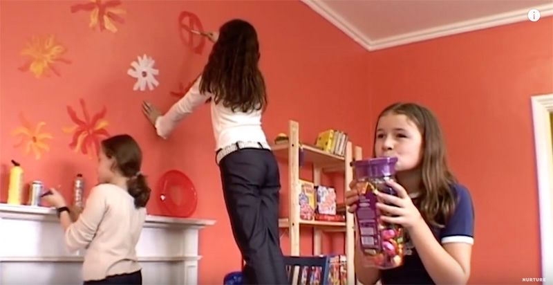 女孩则更乐意“创造”,她们本能地想要创造“美好”的东西,比如拿起颜料在墙上画画。