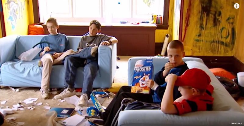 很快,房子脏乱得无处下脚。无政府式地发泄了精力之后,男孩们意识到自己要承受混乱的结果。他们知道不能再无限地霍霍了,便自发地坐下来讨论分工。