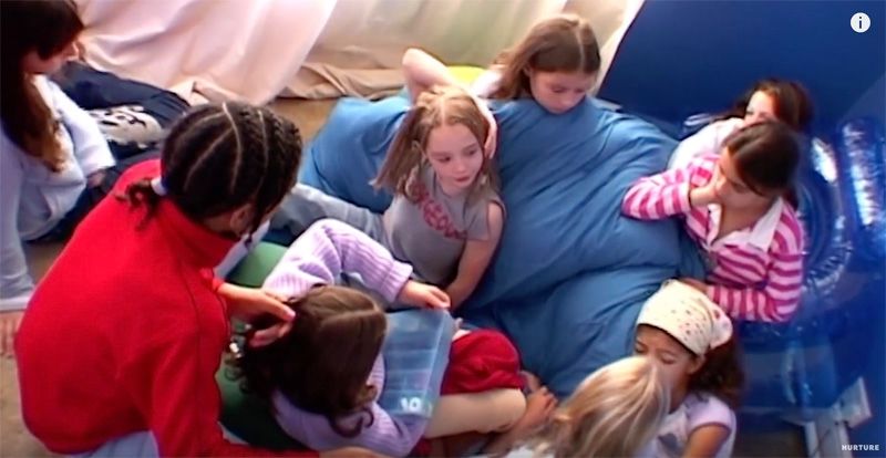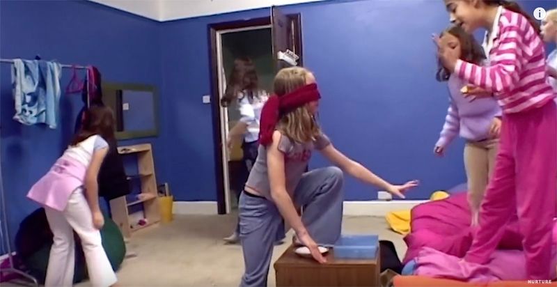 之后的几天,女孩不断创造着有趣的集体游戏:比如“美容院”的化妆游戏、表演动作猜谜、盲人摸象、全体蹦床、跳舞唱歌的才艺秀、轮流讲鬼故事等等。
