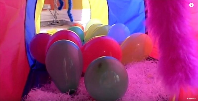 创意层出不穷,女孩萨利还装饰起了“惊喜派对”,帐篷隧道里满是气球。