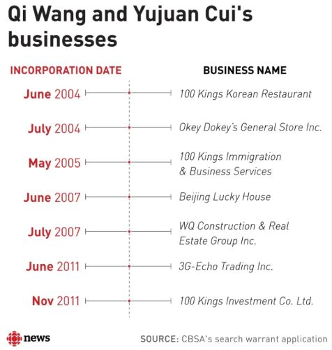 司法部在法庭上提交的一份事实摘要称,CBSA调查人员在王奇和崔玉娟的家中查获的记录中发现了1200多个中国公民的名字,其中有641个出现在联邦或省级移民系统中。其中78人已成为加拿大的永久居民。