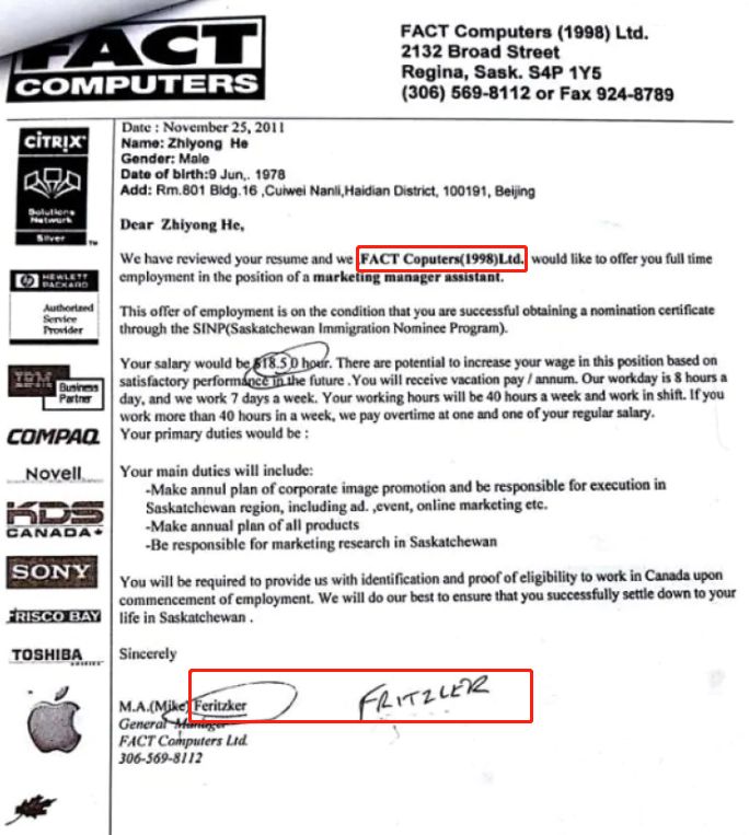 调查人员发现了一封看似有Fritzler签名、来自Fact Computers公司的工作邀请信。