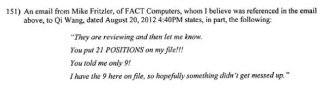 Fritzler表示自己知道王奇会代表其公司提供一些工作机会,自己实际只需要两三名员工。2012年8月20日,Fritzler和王奇的往来邮件显示,他表示愿意提供9个工作机会。