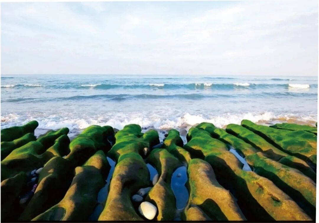 去过台湾最北端新北市石门区老梅里的人都参观过那里的绿石槽海滩,拍出来的照片非常漂亮。海滩岩石出现一系列平行的破裂,绿色海草从岩石裂缝里长出,铺满石面。