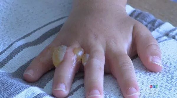 上图,前两天,安省4岁男孩George Young在参加夏令营活动时被野生防风草灼伤,手上冒起了大水泡。