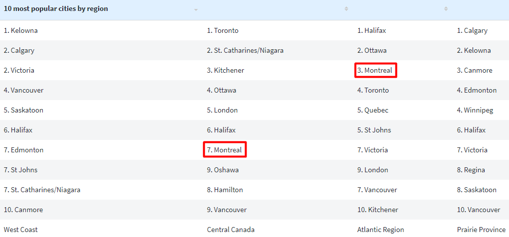 上图是加拿大人最愿意搬去的城市排名,最受欢迎的城市是多伦多(得票率10%),其次是哈利法克斯(9.67%)、圣凯瑟琳(8%)……蒙特利尔排在第8位,温哥华排在第10位……