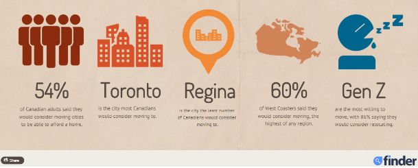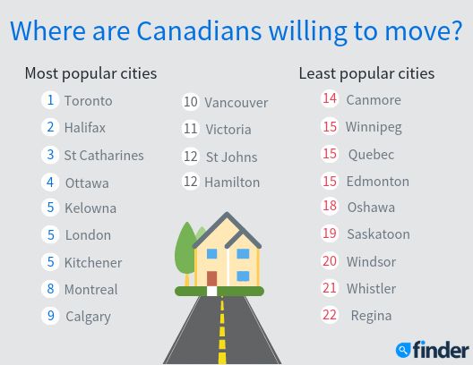 个人理财比较网Finder对1200名加拿大人、22个城市进行调查。结果显示:54%的加拿大人愿意搬家;最愿意搬去的城市是多伦多;最不愿意搬去的城市是Regina……