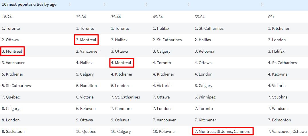 蒙特利尔在所有加拿大人愿意搬去的城市中排名第八,但随着受访者年龄的增长,其吸引力逐渐降低。