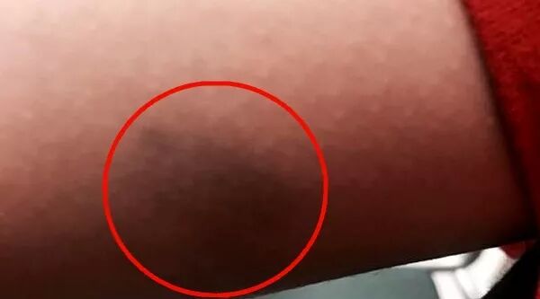 小孩皮肤娇嫩,迅速淤青一片,这孩子当时就被疼哭了。