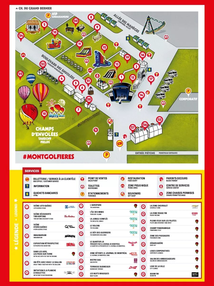 今年8月10日至18日,来自加拿大、美国、法国、巴西100多只热气球将在魁省Saint-Jean-Sur-Richelieu的天空喷薄怒放……不抒情,进正题!去年,热气球节组织者曾为人们提供了一张现场活动示意图: