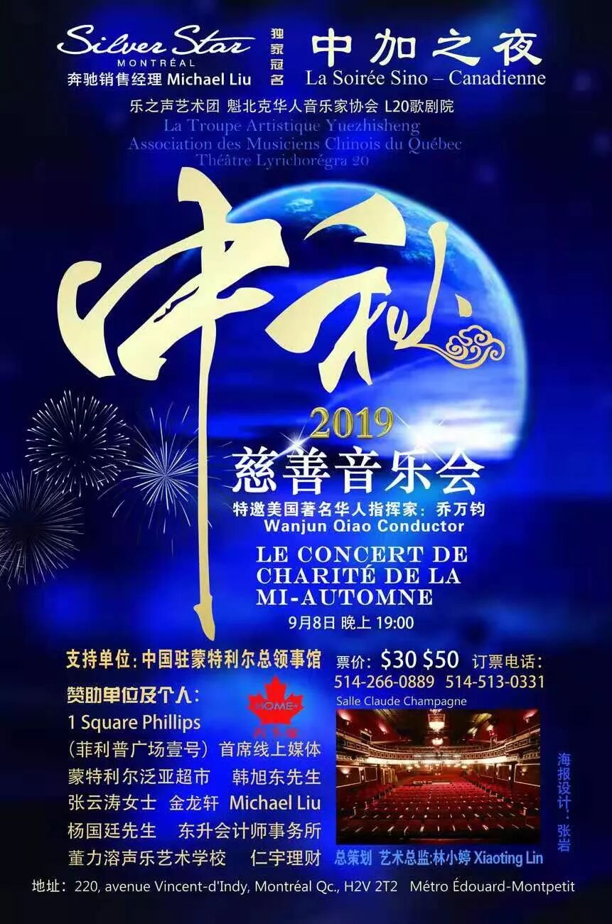 在传统的中秋佳节 及中华人民共和国 诞辰70周年之际 蒙特利尔L20歌剧院的音乐家 与华人音乐家们共同演绎 “中加之夜”2019中秋慈善音乐会 音乐会将在皇家山顶的 古典音乐厅隆重举行 向中国经典音乐作品 全面致敬 拟全部捐助给 蒙特利尔残疾人 休闲、体育和文化组织 《中加之夜-中秋慈善音乐会》 9月8日 晚上 19:00 地址:Salle Claude-Champagne VIP 酒会 9月8日晚上 18:00 地址:220 Avenue Vincent-D’Indy, Montréal, QC H2V 2T2 普通票价:30$ 50$ VIP票价:80$(含酒会) 赞助热线&订票电话 514-266-0889 514-887-9368 514-513-0331 购票&咨询二维码 以下是音乐会中加演员名单,敬请收藏 加国演员 L20歌剧院 女高音歌唱家 Suzanne Taffot Soprano L20歌剧院 男高音歌唱家 Marcel d'Entremont L20歌剧院 女中音歌唱家 Rose Naggar-Tremblay L20歌剧院 男中音歌唱家 Jean-Philippe McClish L20歌剧院 钢琴家 Giancarlo Scalia 中国演员 乔万钧 特邀北美著名华人指挥家。2018中国发展十大杰出文化人物。四川音乐学院指挥系特聘教授。中国海南爱乐合唱团艺术总监。 陈政宇 青年钢琴演奏家,师从邓泰松大师。2007年美国科普斯克里斯蒂国际钢琴比赛第一名。2008年西班牙豪塞伊图尔比国际钢琴比赛第一名。 张仕根 二胡演奏家