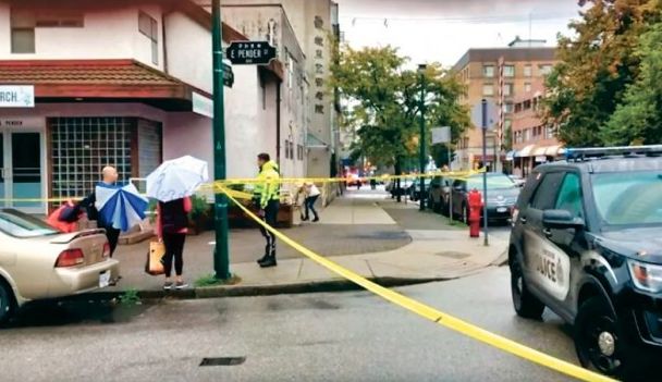 周日下午接近4点时,Hastings街和Dunlevy大道附近传出多声枪响,这里是温哥华毒品使用者地区网络(防止滥毒中心)门前,一名50岁的男子中枪被送往医院。