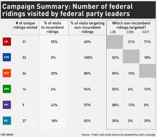 CBC民调分析人士Éric Grenier表示,政党领袖的到来可以鼓舞选区内支持者的士气,放大各党候选人的知名度。同时,党魁们于此地的演讲中还会传递出很多信息,当地媒体对此极为关注。截至目前,自由党领袖特鲁多用了大约一半时间来“巩固自己的地盘”,而另一半时间则去了其他政党的地盘。在自由党目前已掌握的选区中,特鲁多主要走访了大多伦多地区,魁北克乡村地区和大西洋省份---自由党在这些地区的选区虽然当选,但力量相对薄弱,最有可能被别的党夺走。