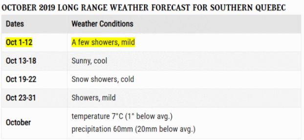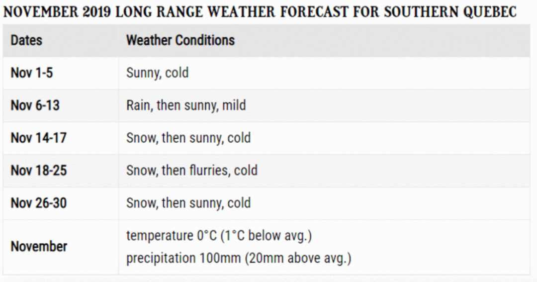 在天气预报界非常有影响的“老农年鉴”,近日发布了魁省南部未来两个月(10、11月)的长期天气预报,这里面,最令人关注的无疑是第一场雪何时“降临人间”。从下图可以看出,老农年鉴对于十月份前十天的预报还是非常准确的:几场降雨,天气还算温柔。19-22日,天气将从cool(凉爽)变成cold(寒冷),同时,降雪也会到来。总体而言,10月份的平均温度是7摄氏度,比往年平均温度低1度,降水也比往年偏少一些。下图表明:降雪预计在11月14日开始,能下多大不知道。而且从14日到月底,天气都比较残酷。雪、大风(flurries),加在一起就是寒冷!北风烟雪,那景象好“美”!根据预报,11月14日之前的天气还算温和。整个11月的平均气温是零度,降水预计有100mm,比往年平均值要多出20mm。11月14日,距离现在还有一个来月,大家趁着现在天气还不错,该看枫叶看枫叶,该换胎换胎吧。如果你不喜欢冬天,请默念雪莱的那句诗:冬天来了,春天还会远吗?