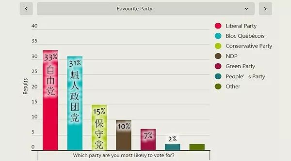 10月10日法语电视辩论之后,民调机构Forum Research随机抽取了1001名18岁以上的魁北克人就其本次大选的投票倾向进行了电话采访。结果显示,有33%选投自由党;31%选投魁北克政团党;选保守党的仅有15%。其中,选投自由党的英语人士比例并未过半,蒙特利尔35%,魁北克北部为44%。那些65岁以上的、居住在蒙特利尔郊外的说法语人士,对魁人政团党情有独钟。分析人士指出,魁北克人重新燃起了对民族政党的热情,这对自由党赢得本次大选极为不利。议席仅次于安省的魁北克,多年来一直是自由党的票仓。上次大选正是因为魁北克人抛弃了自己的民族政党Bloc后改投NDP,之后又放弃NDP改投自由党,才使得自由党胜出。