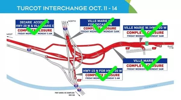 昨日凌晨5点起,720高速公路西行Ville-Marie路段四车道中的三条车道现已开放。此外,720高速上的两个主要匝道也已重开,包括Lucien-l’Allier和du Fort出口。Turcot立交桥重建工程始于2015年,目前工作完成度大约在80%。魁省交通局表示,现正封闭的几条车道、匝道与路口均将于近期陆续开放。