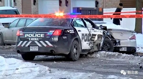 上周六凌晨5点许,一女子报警称其被丈夫殴打,一警车当即奔赴现场处理家庭纠纷。于现场附近街口,警察发现一驾车男子在见到警车后突然调头……警车当即行动,也立刻调头……不料路面太滑,警车失控撞上了停在街边的四辆汽车。被噪音吵醒的一位邻居曾跑去帮助两名警察。该市民告诉记者:“我听到女警在对讲机中说,他们当时的车速大约是每小时104公里……幸运的是,事发时路上没人。”Laval警方表示,警车受损严重,目前尚未接获其他车辆的受损报告;警车中两名20多岁警员均被送往医院,驾车的男警手臂受伤,副驾女警脸部受伤,但均为轻伤;嫌疑人尚未抓到。