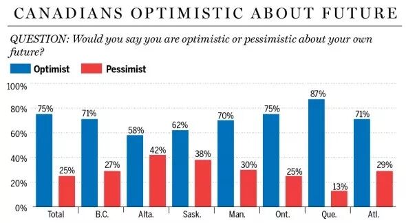 民调还发现,比起加拿大的未来,全国各地的人们更加担心自己的省。当被问及他们对本省的未来是乐观还是悲观时,全国受访者的整体统计是“几乎各占一半”,乐观者53%,悲观者47%。在各省人民的表态中最值得一提的,是阿尔伯塔和魁北克两省人民之间的差距,堪称“截然相反”。阿省有77%的人对本省的未来感到悲观,而魁省有73%的人对本省的未来感到乐观。抛开国家,也抛开自己的省,对自己的未来感到乐观的加拿大人多达75%。仍以阿尔伯塔省为例,虽然只有不到30%的受访者对加拿大的未来感到乐观,但对自己未来感到乐观的受访者,竟多达58%。据研究,一个人对自己处境的乐观程度,是随着收入水平的增加而上升的---“年收入低于2.5万的加拿大人中有68%的人感到乐观,而年收入超过10万的加拿大人,乐观者超过了80%。”此项研究的真正含义是,大多数收入比较低的家庭,其乐观的比例并不低……如果说上面阿省人民的例子并不明显,那么请看魁北克人:民调显示,加拿大最乐观的人群基本上都住在魁北克,那里有87%的人对自己的未来感到乐观。不同地区,不同性别,不同年龄段的受访者,于此观点竟不谋而合:在本次调查中,担心下一代未来的受访者比例高达61%,这与2016年相比,增加了5个百分点。
