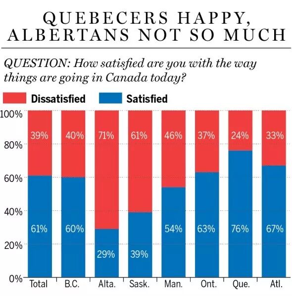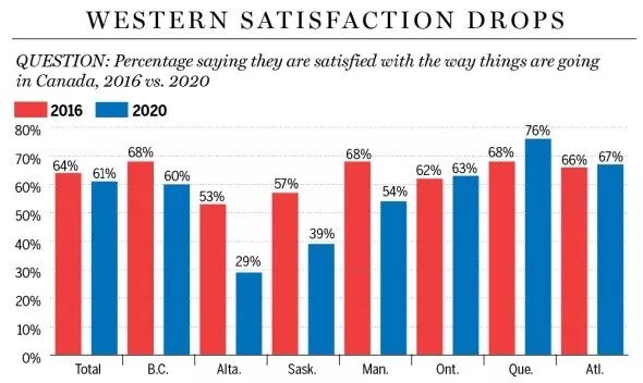 一项最新民意调查验显示,人们对加拿大是否满意,很大程度上要取决于你住在哪里。这份标题为“两个加拿大”的调查报告称,“不是所有加拿大人都对新的一年有“看涨”的憧憬,虽然对国家发展方向感到满意的加拿大人占到了大多数,然仍有一些加拿大人担忧、焦虑……”“草原省份的气氛就十分凝重,那里的人们普遍对此话题感到悲哀。”“加拿大人对国家未来的感觉,在很大程度上与居住地有关。”民调显示,加拿大中部、大西洋省以及不列颠哥伦比亚省的加拿大人,对加拿大发展的满意度,超过了60%。而在阿尔伯塔省和萨斯喀彻温省,人们的情绪完全相反,只有29%的阿尔伯塔省人和39%的萨斯喀彻温省人,对加拿大的发展方向感到满意。要知道,就在四年前(2016年),阿尔伯塔省还有53%的人对加拿大信心满满。萨斯喀彻温省是57%。数字“急剧下降”,阿省人民的心情不难理解:能源掉价,经济下滑,跨山石油管道扩建受阻……最重要的是,那里的人民正怨声载道---“联邦不公”。与阿省、萨省相比,曼尼托巴人的心情稍好一切……但也没好到哪里去。虽然今年约有54%的曼省人对国家发展方向感到满意,但这一数字比起2016年,仍下滑了14个百分点。有46%的加拿大男性说,他们对加拿大的发展方式感到不满。而持同样观点的女性,只有32%。于性别角度的调查中,不同年龄组之间的观点差异相对较小。