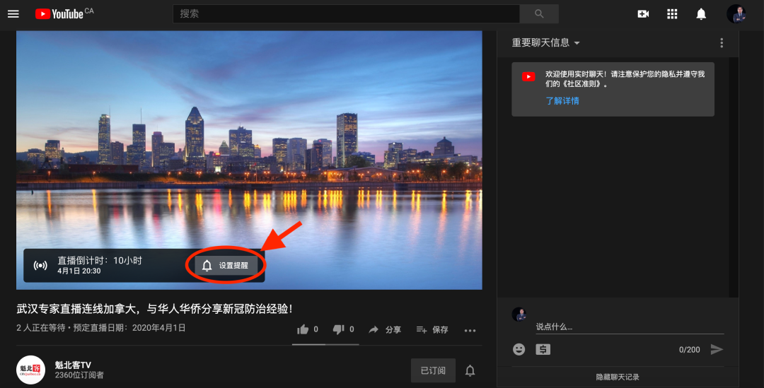 第一场、4月1号,今晚8:00-9:30(加东时间)熊念医生:武汉红十字医院院长,医学博士。介绍武汉红十字会医院的抗疫情况;范忠杰医生:武汉红十字医院呼吸内科主任。有关新冠肺炎的防治措施,与观众互动答疑;第二场、4月2日,晚8:00-9:00(加东时间)陆小霞医生:武汉儿童医院呼吸内科主任。主讲武汉儿童医院抗疫经验以及新冠肺炎儿童防护措施等;第三场、4月3日,晚8:00-9:00(加东时间)陈晓蓓医生,武汉大学人民医院感染科主任。介绍武汉大学人民医院抗疫经验及新冠肺炎家庭及高危人群的防护措施;直播将在YouTube魁北客TV展开,扫描下面二维码进入直播:直播期间,观众可以在留言区提问,专家为您答疑解惑。如果您找不到直播位置,可参考下面的引导:
