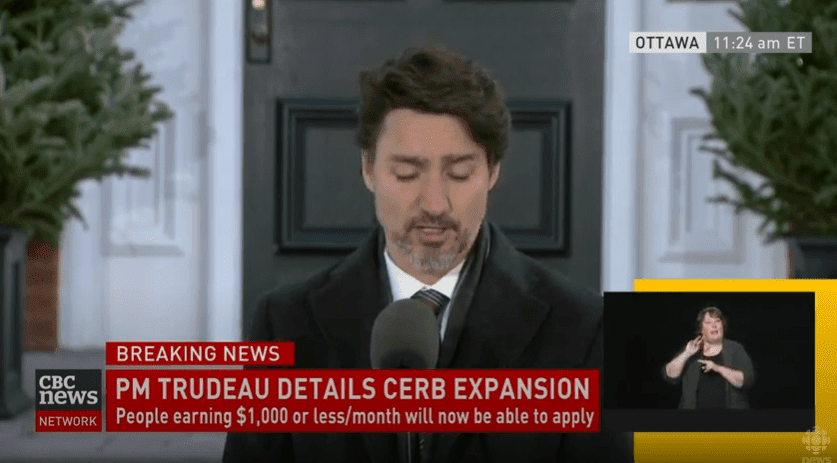 特鲁多今天宣布了加拿大紧急救援福利(CERB)的扩展计划,这个计划使那些仍在工作、但月收入少于$1000的人获得援助。特鲁多承诺,政府将“尽快”给月薪低于2500加元的一线工人提高工资。