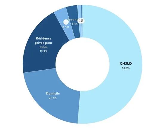 接下来,谭博士话锋一转,“先撇开魁北克省不说,我们真正忧心的是蒙特利尔大都市区,那些在蒙特利尔、拉瓦尔、Montérégie和Lanaudière各市、区层出不穷的确诊病例。蒙特利尔大都市区是传染密集的高爆区,区内的长期照护中心(CHSLD)和老年公寓(RPA)遭受了最为惨烈的重创。而区外,几乎都没怎么受影响。安省全省54%的COVID-19确诊病例集中在多伦多大都市区,而蒙特利尔大都市区的确诊病例在魁省的占比竟高达74%。如果去除蒙特利尔、拉瓦尔两市的数据,那占比应回落至56%。“蒙特利尔的情况实在堪忧”,流行病学家玛舒夫坦言道。对长期照护中心和老年公寓的疏忽,是魁省COVID-19应对处置工作中的薄弱环节,70%以上的病亡数来源于上述场所。并且,魁省老年人在这些场所的居住比例也明显高于其他省份。注意,加拿大全境的老年人有一半居住在魁省;魁省人口的老龄化程度明显高于其他省份。因此,面对突如其来的大疫,公共卫生尤显脆弱。下面的圈状图是病亡数在不同生活场所的分配比例。从占比看,分别为长期照护中心(CHSLD)51.3%、居家21.4%、私营老年公寓(RPA)、医院中心3.5%、转介来源3.1%和其他1.4%。数据来源于魁北克公共健康研究院(INSPQ),数据更新至2020年4月15日: