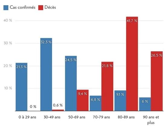 目前,在全加拿大,魁北克省是已开展检测数量最多的省份,因此发现更多的确诊病例兴许也是正常的。而对病亡数的分析,相对要复杂些。魁北克公共健康研究院(INSPQ)医学顾问理查德J· 柯特(Richard J. Côté)博士解释说,在魁省,并非所有宣布死于COVID-19的患者都接受过病毒筛选。“尤其是我们现在有目共睹的,在一些场所集中爆发的疫情,首批发病的患者是经过检测确认的,而之后陆续发病的患者,我们就依据流行病学关联性来做出确诊判断,无需再经采检。”目前我们尚不清楚安大略省在统计病亡数时是否采用了相同方法。“要弄清统计数据的虚实,必须深入分析相关的监视系统,但这得等大流行结束后才能进行了。当下,大家都忙得晕头转向,实在无暇顾及”,盖伊教授进一步解释道。圣嘉斯汀妇幼大学医院中心( CHU Sainte-Justine)的儿科医生,同为微生物学家、感染学家和流行病学家的卡罗琳娜·卡诗·谭(Caroline Quach-Thanh)博士也提请民众保持理智,不要盲从,因为各省数值在统计方式上可能存在偏差。接下来,我们用图形来看看魁省COVID-19确诊病例和病亡数在各个年龄组的分布情况,蓝色和红色柱状分别代表确诊病例和病亡数。数据来源于魁北克公共健康研究院(INSPQ),数据更新至2020年4月15日: