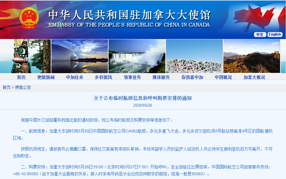 中国驻加拿大大使馆最新消息,5月30日国航将派CA562航班,多伦多直飞大连,接中国留学生回国。这是本月以来中国派出的第四个临时航班,根据大使馆网站显示的购票安排,加拿大东部时间5月26日19:00(北京时间5月27日7:00)开始呼叫,至全部座位出票结束。如果你看到这则消息才想要买票,那么几乎没有成功的可能。这些座位应该是留给之前就登记预定的留学生。