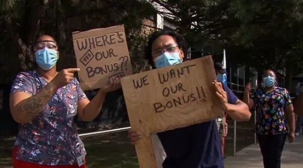 大约20名蒙特利尔Côte Saint-Luc市Maimonides Geriatric Centre的护理人员昨日上街示威,要求政府支付承诺的奖金。护理人员Andrea Osbourne说:我们将家人、朋友置于危险之中,我们应该得到我们应得的东西。另一名护理人员说,她已被拖欠了近$3,000。