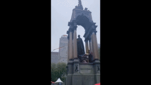 由非裔和原住民团体举办的联合示威游行过程一直是平和的。但游行之后变调,一群激进人士爬上纪念碑,在雕像身上系上红绳子,并且绑上多面旗帜,红绳一拉,雕像应声从纪念碑基座被连根拔起。更悲惨的是,雕像落地剎那,头部因撞击力道,断裂飞到路边地面上。
