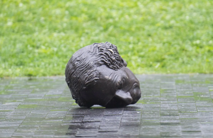现场视频显示,因雕像落地时遭到猛烈撞击,其头部当场断裂,犹如被“斩首”……