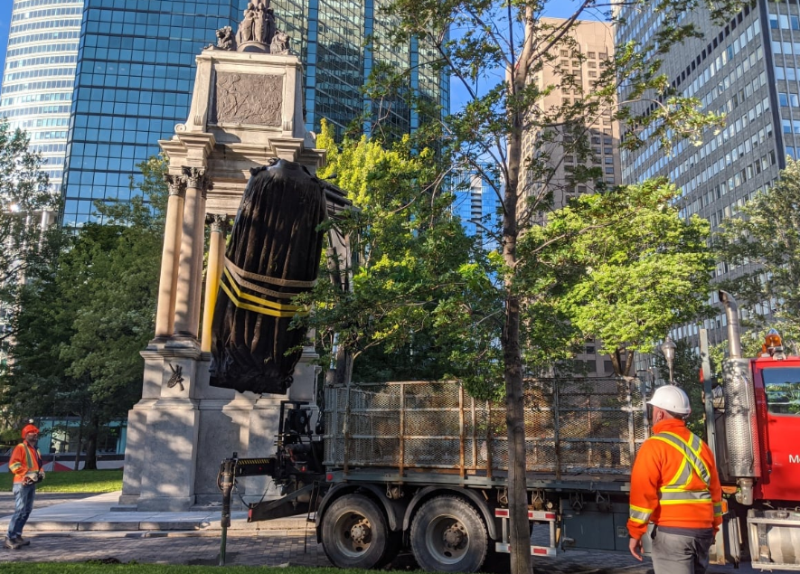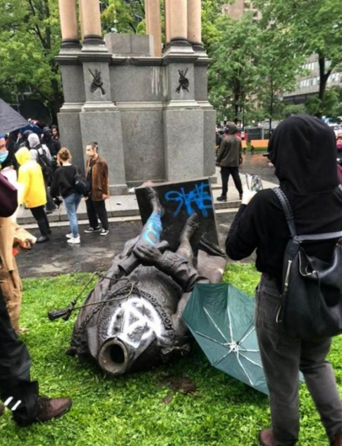 蒙特利尔警方表示,这尊雕像在下午2:45左右被推倒后,还被示威者喷上了蓝色涂鸦。目前并不清楚,推倒雕像的这群人是否和游行者是一伙人。但雕像落地,让警方,主办单位和示威民众都相当意外。一位加拿大广播公司的记者从示威者那里获得了一张传单,这张传单解释了这一行为,传单上说:一份网上请愿书,已经有超过46000个签名,要求蒙特利尔市市长Valérie Plante移除这个雕像。传单写道:“约翰·麦克唐纳爵士是一位白人至上主义者,通过创建残酷的寄宿学校系统来策划原住民的种族灭绝,并倡导其他攻击原住民文化和传统的措施。”传单上说,由于市政府的不作为,“一个由年轻的积极分子组成的多元化联盟”决定采取行动……”截至周六下午,警方未逮捕任何人。周日早上,市政工人用起重机将雕像从地面上移走了。魁省省长乐高谴责推倒雕像的行为,他在推特上说,“无论人们怎样评价约翰·麦克唐纳,以这种方式摧毁一座纪念碑都是不可接受的。我们必须与种族主义作斗争,但摧毁我们历史的一部分并不是解决方案。故意破坏公共纪念物在我们的民主制度中没有容身之地,必须恢复雕像。”蒙特利尔市长Plante在周六发表的一份声明中说,市公共艺术办公室和历史文物专家将协调雕像的修复工作。她在声明中说:“我强烈谴责今天下午在蒙特利尔市中心发生的破坏行为。”她说,一些纪念碑有争议,“但是讨论和行动必须和平进行,不得诉诸破坏性行为。”约翰.麦克唐纳John A. Macdonald是加拿大建国后的第一任总理、被称为是加拿大的国父,加拿大有许多中小学和公共建筑物以麦克唐纳的名字命名。