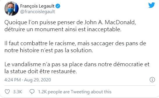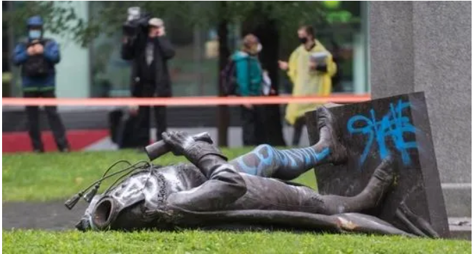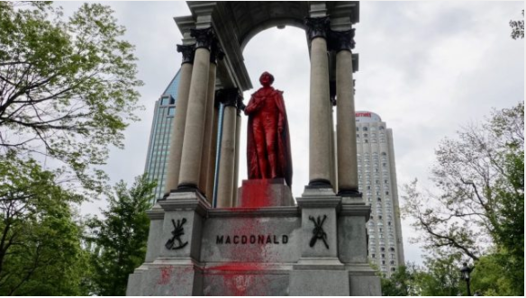 上周六(8月29日),蒙特利尔一场呼吁消减警察预算的游行之后,示威者们拉倒了位于市中心广场的加拿大首位总理约翰·亚历山大·麦克唐纳的雕像。