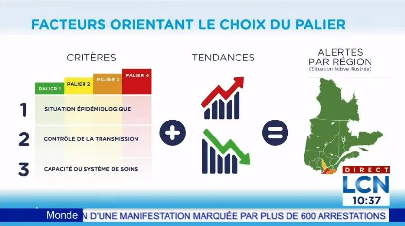 9月8日,魁省正式启用新式“COVID-19警报系统”(Système d’alertes COVID-19)。作为省政府面对可能到来的第二波大流行所作的准备之一,当局用红、橙、黄、绿四种颜色,提醒省内不同地区所面临的疫情风险。