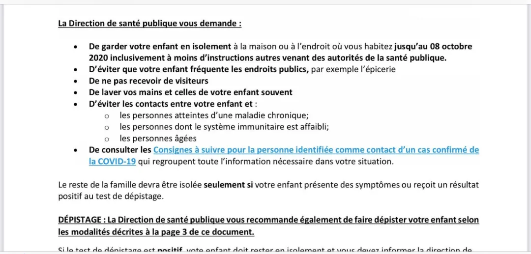 至于老师请假两周,只能往好处想了,老师是休假了……王先生说儿子很懂事,在回家的路上,除了平常戴的口罩,儿子特意把学校临时发的口罩也戴上了,双层防护,怕一旦有事传染给大人。就在王先生接受魁北客传媒采访的时候,收到了卫生部门发来的邮件,除了一些隔离的注意事项之外,还建议孩子去做检测,如果是阴性,在家做预防性隔离就可以了。