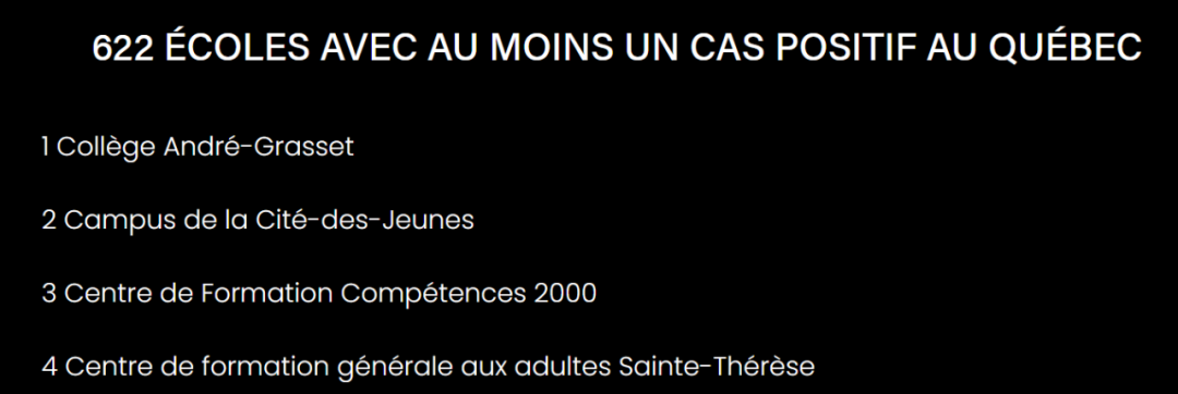 截止记者发稿时,根据学校疫情民间统计网站www.covidecolesquebec.org的数据,魁省已经有622所学校出现疫情。