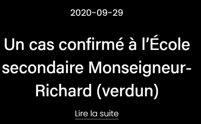 今早,一位愤怒的华人家长王先生联系了魁北客传媒,讲述了儿子因上学而被隔离的事情。他说,昨日下午两点,家长接到学校电话,说孩子班级有同学确诊,现在全班隔离,请家长立即赶往学校把孩子接回家。孩子所在的学校叫做l’École secondaire Monseigneur-Richard ,位于蒙特利尔Verdun区。在魁省统计学校确诊的民间网站上,标明该校有一例确诊。