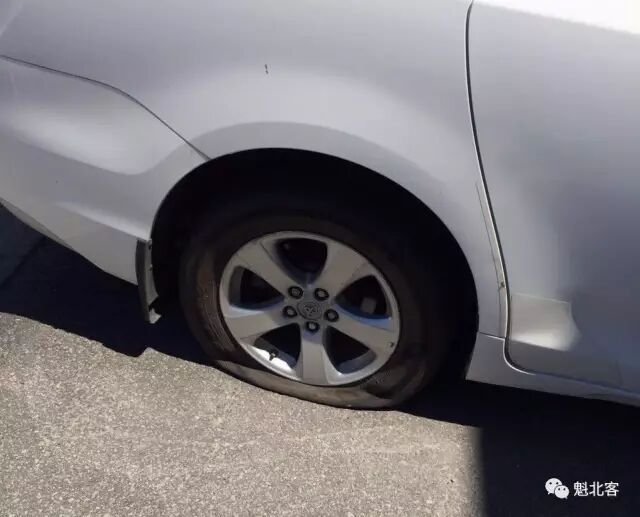 车停到了家门前,易先生一心想检查轮胎。这时身后不知道从哪过来一位白人男子,关切问是不是需要帮助,并一起蹲下来做检查状。轮胎瘪瘪的,有一道为利器所扎破的口子。