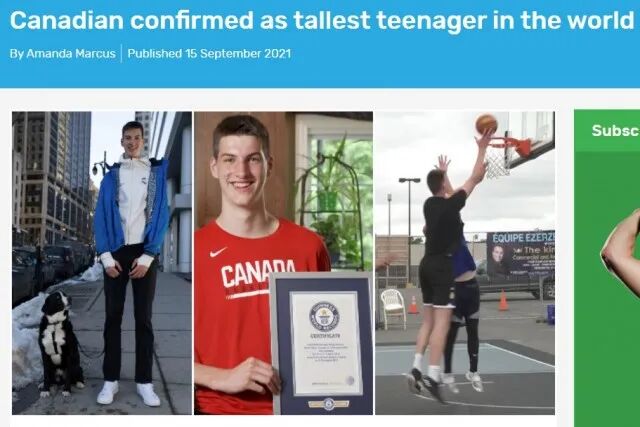魁省15岁少年Olivier Rioux最近收到吉尼斯认证——他是世界上最高的男性青少年!Olivier现在的身高是7英尺5.33 英寸(2米268982)——比多伦多猛龙队的任何一名球员都要高。据报,Olivier出生时的体重是7.5磅(3.50公斤),这并不“特别”……但是,他在第一个月内就长到16磅(7.26公斤),并从此一发不可收拾。他成长得“相当快速”。Olivier父亲的身高2米03,母亲的身高是1米85。考虑到父母身高,医生曾预测Olivier最高会长到1米96……可没想到,Olivier早早就冲破预言,12岁的身高便已达到2米11!查了一下,姚明2米26,叶莉1米93,他们的女儿11岁时是1米70……别比孩子了,这个15岁男孩现在就已经比巅峰时期的姚明还要高!