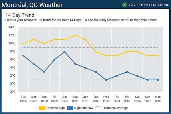 根据目前天气预报,蒙特利尔地区本周最低气温3℃(体感7℃),最高气温12℃(体感10℃),以多云天气为主。