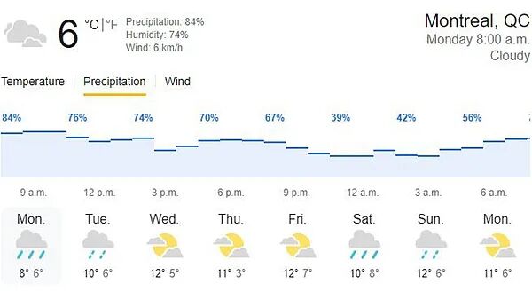 蒙特利尔周一至周二大概率有雨;周三、周四、周五晴间多云;周六、周日继续降雨,概率70%。