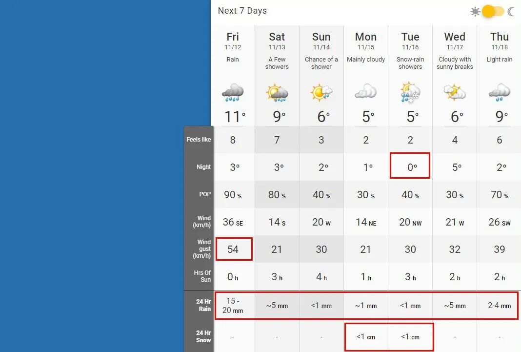 该网站显示,从明日(周五)起直到下周四,每天均将“阴阴沉沉,稀稀拉拉”……尤其是明日(周五),雨量将高达15-20mm,风力时速54公里(6级强风)。