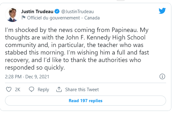 昨日,一名蒙特利尔高中教师被16岁学生刺伤,当时还有其他学生在班里正在上课。