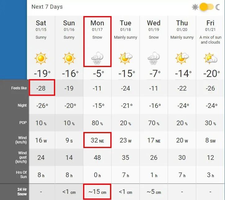 加拿大环境部和气候变化部昨夜发布降雪警告称,一个来自东海岸的天气系统可能会在下周一给大蒙特利尔地区带来15……甚至20厘米的降雪,外加时速32公里的东北风……