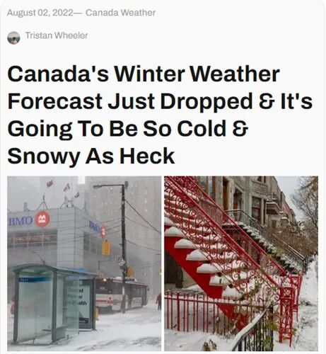 快享受当下吧,加拿大今冬会很糟糕——预言神准的“老农年鉴”(Farmer's Almanac)近日发布长期天气预测称,从今年12月到明年2月,加拿大全国各地均将迎来一个既寒冷又多雪的冬天。
