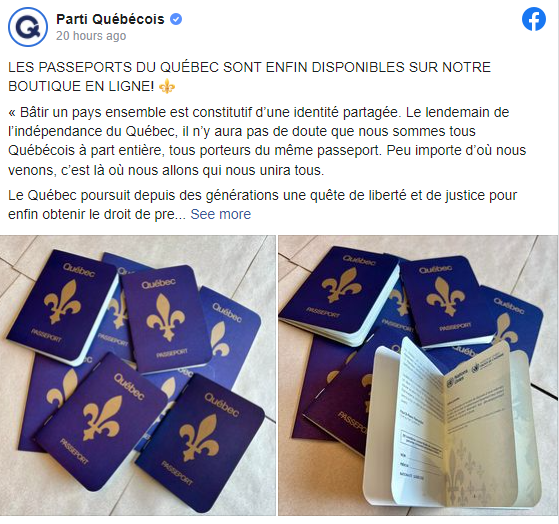 民意调查落后,政治献金落后,咋整?不知道是谁,竟然想到了“卖魁北克护照”的主意。是的,你没看错:魁人党PQ正式出售“魁北克护照”!深蓝色的封皮上印有烫金鸢尾花以及Québec passeport字样。在里面,买家可以签上自己的名字,但是国籍已经预先印好,那就是——魁北克。