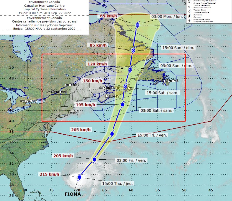 环境部预计,飓风将在周五夜间至周六早晨在新斯科舍省和布雷顿角“硬着落”,并于周六夜间至周日早晨抵达魁北克东北部海岸和拉布拉多东南部。气象局表示,强风和降雨将对爱德华王子岛东部、新斯科舍省东部、纽芬兰西部、魁北克东部和拉布拉多东南部产生重大影响。“菲奥娜”可能会在相当大的范围内造成100至200毫米的降雨,靠近飓风路径地区的降雨量可能会更高。部分地区,如丘吉尔瀑布和拉布拉多市还发布了降雪预警。加拿大飓风中心的气象学家伊恩哈伯德警告说:“大多数受影响地区的风速将超过每小时100公里,新斯科舍省东部、布雷顿角和爱德华王子岛部分地区的阵风可能高达每小时140公里。”