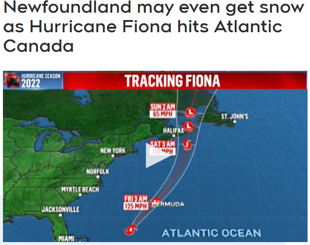 刚刚席卷波多黎各及加勒比等地的四级--“死亡级”飓风--菲奥娜(Hurricane Fiona)正一路向北,冲向加拿大。CTV,CBC和Global News等新闻平台纷纷启动了飓风实时追踪器。追踪器显示,该飓风现位于黑貂岛西南偏南2,000多公里处,风速为每小时215公里。飓风正以每小时24公里的速度向东北移动,且正在加速。